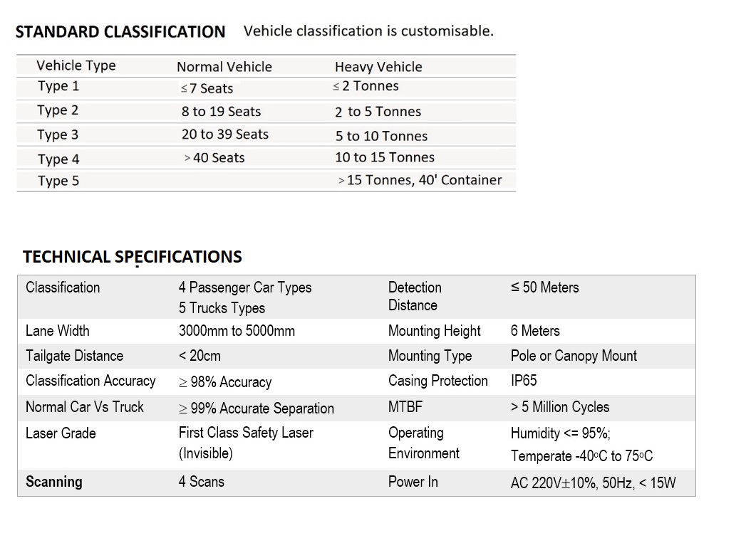 LVP108 classifies vehicle using the laser technology. Using safe laser beams, the system scans a passing vehicle multiple times to instantly map the shape of the vehicle and obtain its’ complete measurements and various parameters. These inputs will then be channeled to the core processor for classifying the vehicle. In addition, other details such as vehicle features, behavior, driving direction, vehicle load condition etc will be obtained.