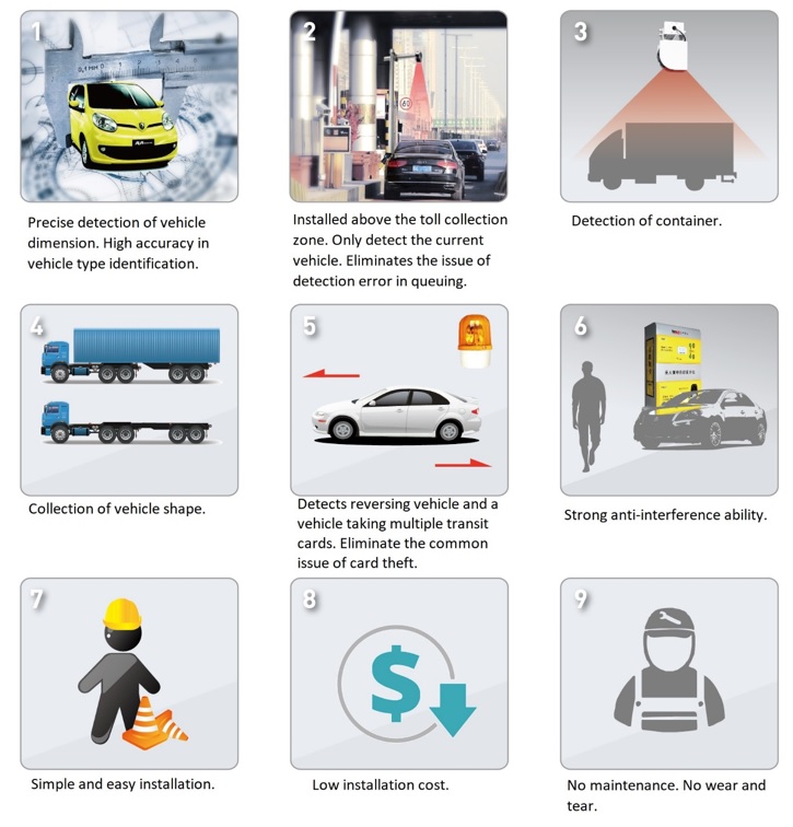 When LVP108 is installed at automatic ticket dispensing lanes, it will resolve the issues of ticket theft. When deployed at ETC lanes, it verifies vehicle type accurately before toll fare is collected. LVP108 is designed for future expansion of ETC on heavy vehicles.