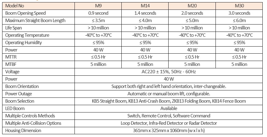 Opening/closing speed ranges from 0.9s to 3.0s.